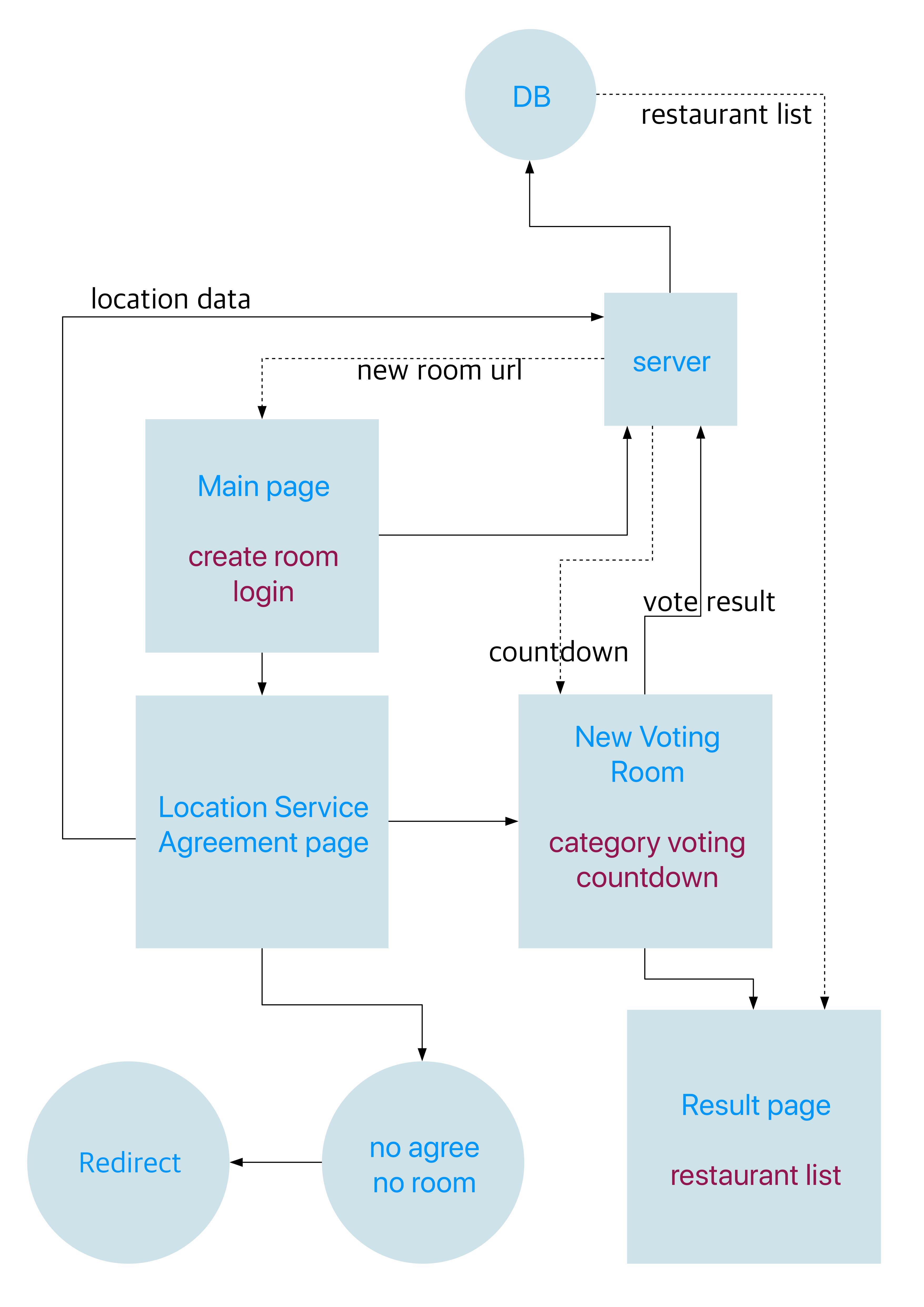 점심에만 하면 다행인데 하루에 최소 두번은 하는 고민이지 싶다. 그래서 조금이나마 이런 고민을 덜어주고 오히려 이런 고민을 단순하지만 재밌게 게임처럼 메뉴를 골라볼 수 있도록 런치고고를 만들었다. 서버와 클라이언트 모두 자바스크립트 기반의 node.js 와 리액트를 사용했다. 전체적인 플로우는 다음과 같다.