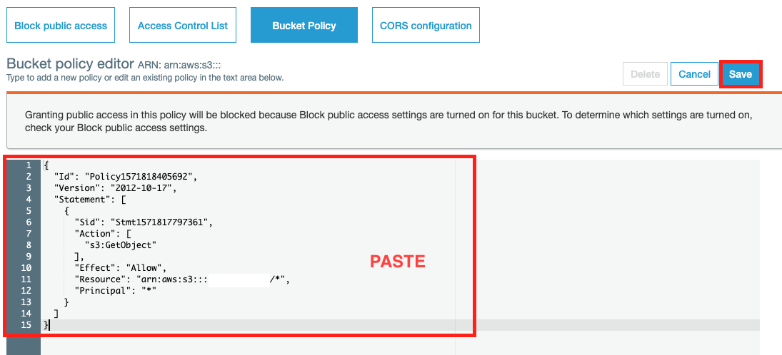 위에서 복사한 JSON Policy 를 아래와 같이 Bucket Policy 에 붙여넣기 하고 Save 한다. 아마 Save 가 되면 경고가 뜰텐데 S3 를 public 접근하도록 했기 때문에 알려주는 것이다. 넘어가자.