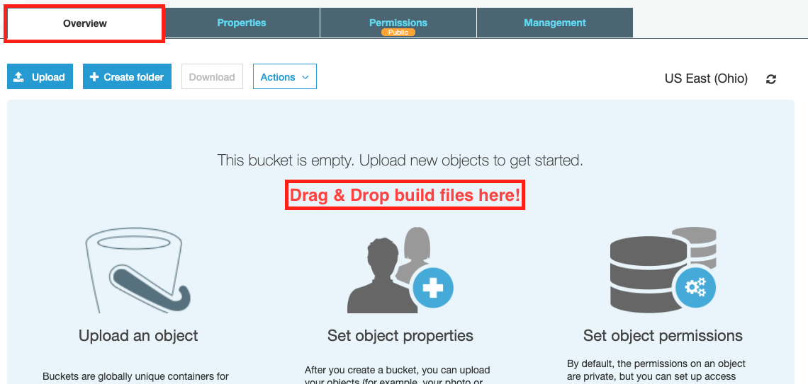 이제 마지막이다. 상단의 Overview 탭으로 가서 아까 생성했던 build 폴더에 있는 모든 파일을 드래그애서 업로드하자.