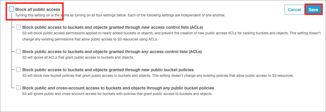 다음으로 Permissions 탭으로 넘어가서 Block public access 에서 "Block all public access" 설정을 해제하고 Save 한다.