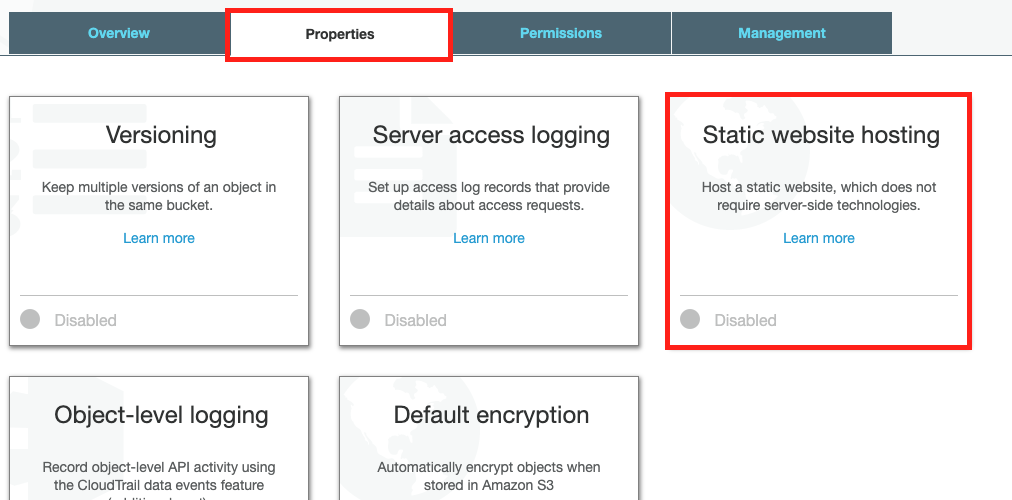 생성된 버킷을 클릭하고 상단의 Properties 탭에서 Static website hosting 또는 정적 웹사이트 호스팅을 클릭한다.
