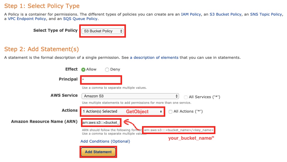 하단에 위치한 Policy generator 를 클릭하면 아래와 같은 새창이 열린다. Actions 에서는 GetObject 라는 것을 선택하면 되고, ARN 은 화살표처럼 버킷이름과 키이름을 입력하고 Add Statement 를 클릭한다.