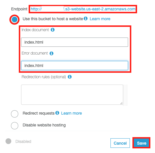 그럼 아래와 같이 선택하고 index.html 을 입력하고 Save 한다. 여기서 Endpoint 가 배포된 react-app 의 주소값이다.