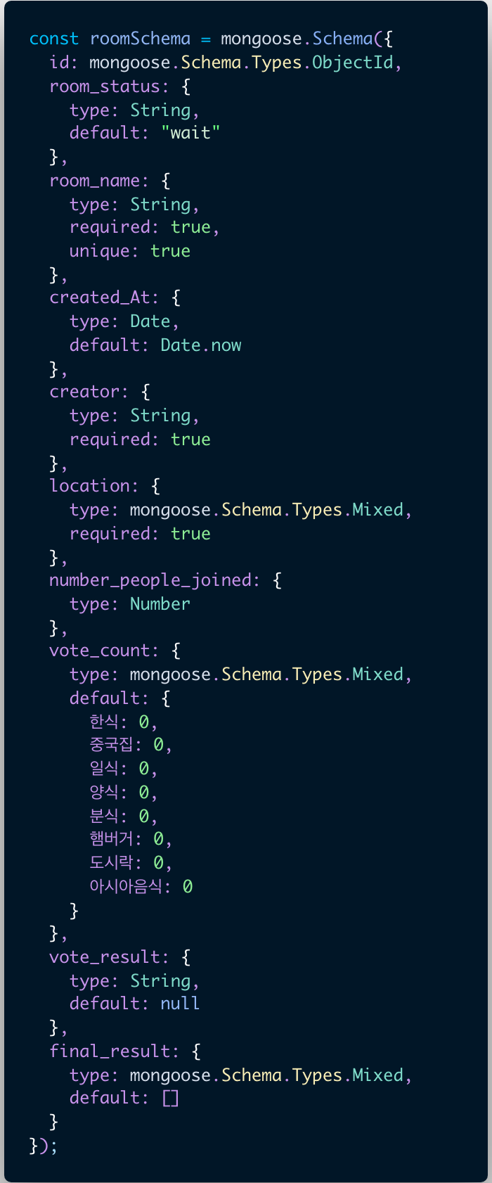 실시간으로 받아오는 식당 정보는 그때그때 생성된 투표방의 투표 결과에 따라 즉시 저장하고 내려주기 때문에 잘 짜여진 테이블에 데이터를 넣기를 선택하기 보다 원하는 정보를 그때그때 수정하고 넣을 수 있도록 mongoDB 를 활용했다. 처음 아이디어를 구상할 때는 DB를 사용하지 않고 진행하는걸 고려했었다. 이유는 투표가 이루어 질때마다 DB에 저장할 것이라고 생각해서 분명 딜레이가 생길거라고 예상했다. 그리고 실시간으로 딜레이 없이 논스탑 클릭킹을 구현하려면 서버와 DB 소통에 무리가 있을것이라 생각했었다. 사실 이 부분은 오히려 서버는 없어도 DB는 있어야 중간이나 투표 종료 후에 입장하는 유저에게 보여줄 수 있는 정보가 기본적으로 저장되어 있어야 한다고 결론 지어졌다. MongoDB는 기본적으로 객체 형태이기 때문에 아주 손쉽게 사용할 수 있었고, mongoose 모듈을 사용하여 데이터의 CRUD 가 자유로웠다. 아주 익숙한 모양이지 않은가? 하지만 체감상 SQL 데이터베이스보다 약간 딜레이되는 느낌이 들기도 했다. 그렇게 스키마를 작성하고, MVC 모델을 이용하여 데이터와 서버의 플로우를 구성했고 비동기적인 처리로 서버와 DB 간의 딜레이를 최대한 줄였다. 이 부분은 socket.io 부분에서 다시 한번 설명하려고 한다. 그리고 mongoDB 에서 제공하는 Atlas 클라우드 서비스를 활용하여 시작부터 데이터베이스를 띄워놓고 바로바로 테스트하며 서버를 만들 수 있어서 굉장히 편리했다. 그리고 무료로 제공하는 DB의 크기가 넉넉해 배포까지도 무리 없이 진행할 수 있었다.