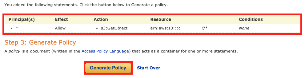 하단에 위치한 Policy generator 를 클릭하면 아래와 같은 새창이 열린다. Actions 에서는 GetObject 라는 것을 선택하면 되고, ARN 은 화살표처럼 버킷이름과 키이름을 입력하고 Add Statement 를 클릭한다.