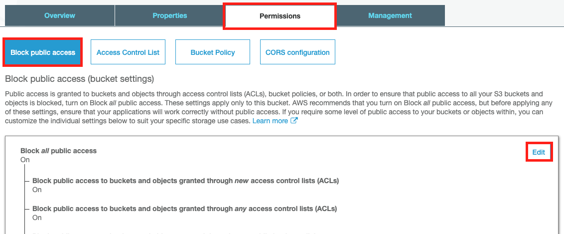 다음으로 Permissions 탭으로 넘어가서 Block public access 에서 "Block all public access" 설정을 해제하고 Save 한다.
